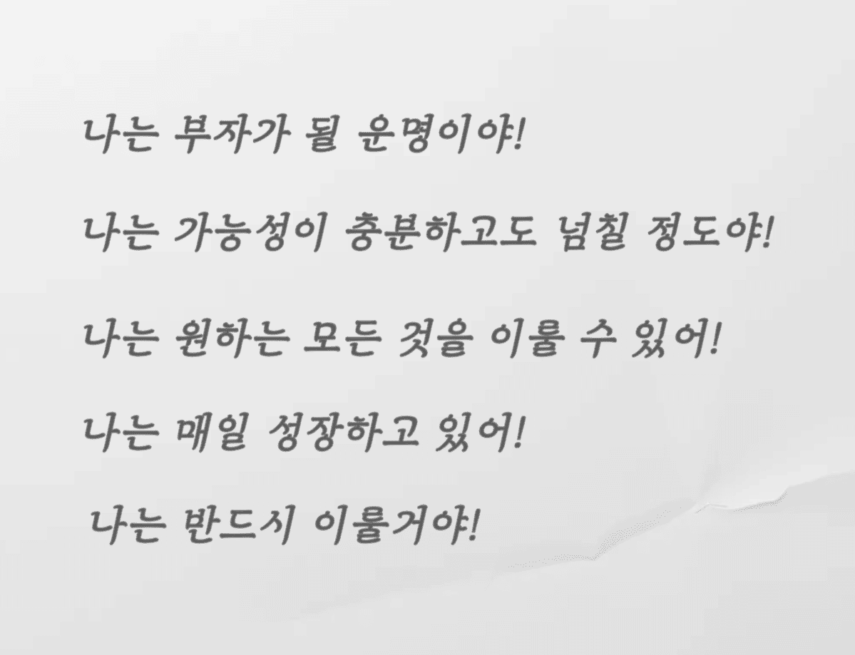 ✔ 부자의 언어 - "나는 돈을 벌 기회를 찾을 것이다.", "돈은 나에게 쉽게 흐른다.", "나는 부자가 될 운명이다."