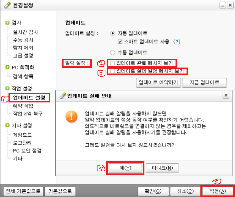 ㅇ 메뉴화면의 환경설정 > 업데이트 설정 > 알림설정 > '알림설정'의 두 가지 항목을 모두 체크표시 해제 > 업데이트 실패에 대한 안내 팝업 시 '예(Y)'를 클릭 > 적용