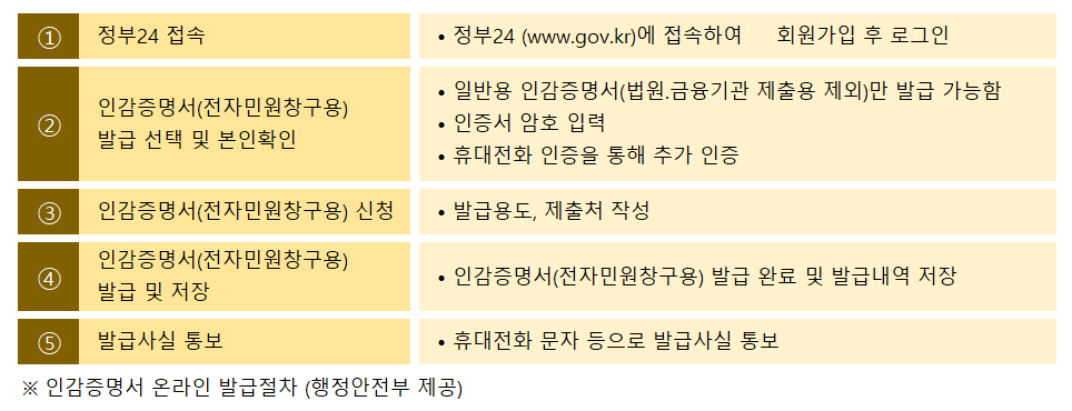 (1) 정부24를 통한 인감증명서 발급은 본인만 신청 가능하며, 기존 인감증명서와 구분하기 쉽게 전자민원창구용 전용서식이 신설된다. 정부24에 접속해 인감증명서를 발급하면 (2) 발급 사실이 휴대전화 문자 등으로 본인에게 통보된다.