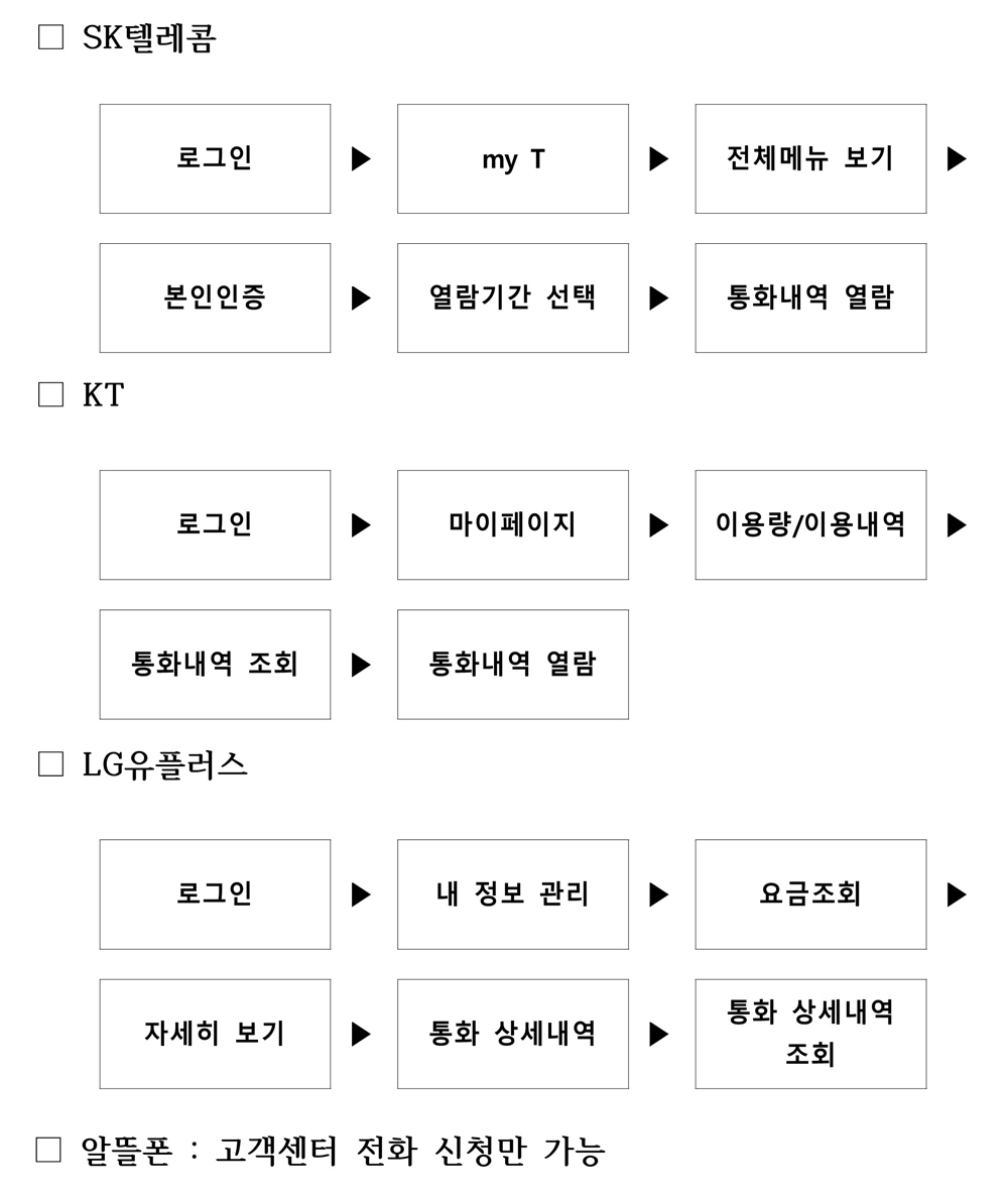 본인의 휴대전화 통화내역을 보고 싶은 이용자는 해당 통신사 홈페이지나 가까운 고객센터에 신청하면 된다. 알뜰폰 가입자는 고객센터 전화로 신청하면 열람신청서를 받을 수 있다.