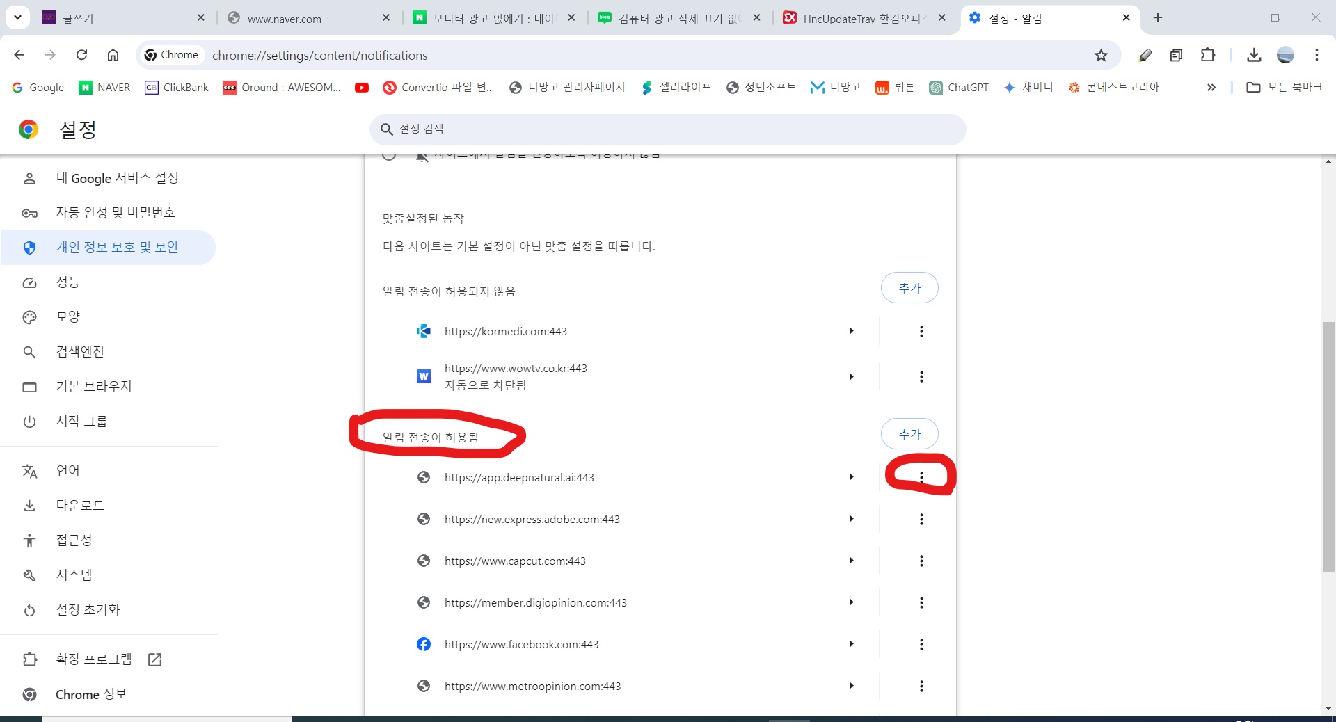 3. 크롬브라우저 광고 알림 제거 : 우측 상단 점 세개 클릭 > 하단의 설정(톱니바퀴 모양) > 개인정보보호 및 보안 > 사이트 설정 > 알림 > '알림 전송이 허용됨'이라고 표시된 각 사이트들의 우측 점 세개를 클릭 > 차단 또는 삭제를 클릭