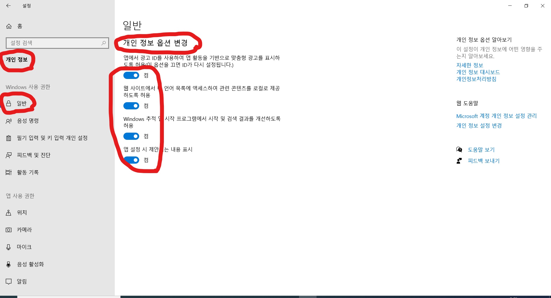 > 개인 정보 옵션 변경의 4가지 항목을 모두 '끔'으로 변경