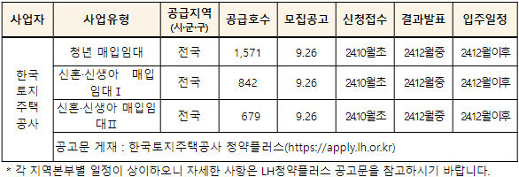 ○ 청년, 신혼·신생아 매입임대주택 신청 : 2024년 9월 26일부터 ~ 지역별로 상이