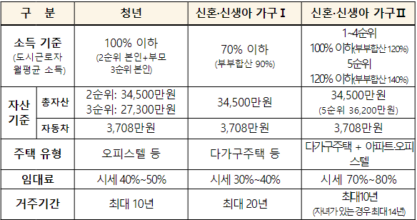 2. 공급 대상 및 임대주택 정보 : 무주택자인 미혼 청년과 신혼·신생아 가구가 대상이며, 시세의 30~80% 임대료로 최대 10년간 거주 가능