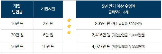 - 납입금 지원 : 근로자 납입금의 20% 해당 금액을 기업지원금으로 추가 지원