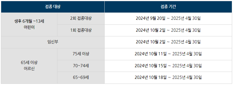 ○ 독감 예방접종 무료 : 2024년 9월 20일 ~ 2025년 4월 30일까지