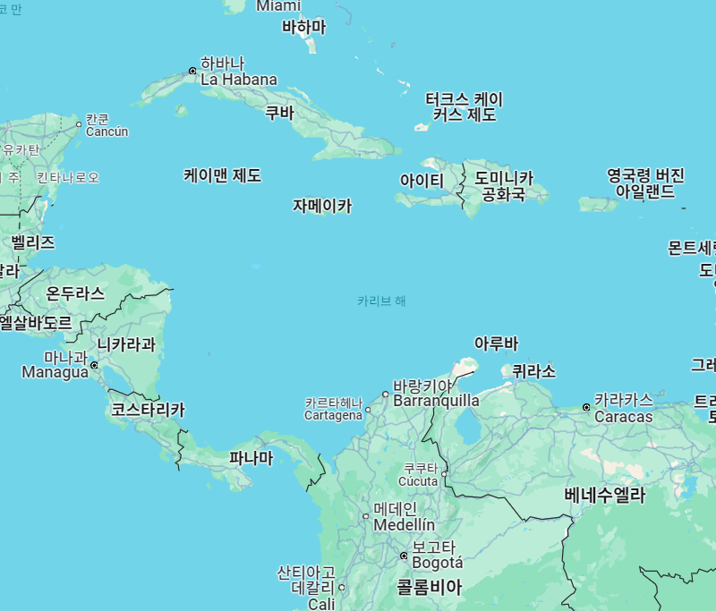 카리브해는 공식적으로 색깔이 이름에 포함되진 않았지만, '터키석 바다'라고 불리는 경우가 많습니다.