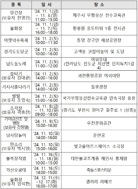 ○ 전국에서 무료로 즐기는 국가무형유산 행사 개최 : 11월 1일부터 연말까지