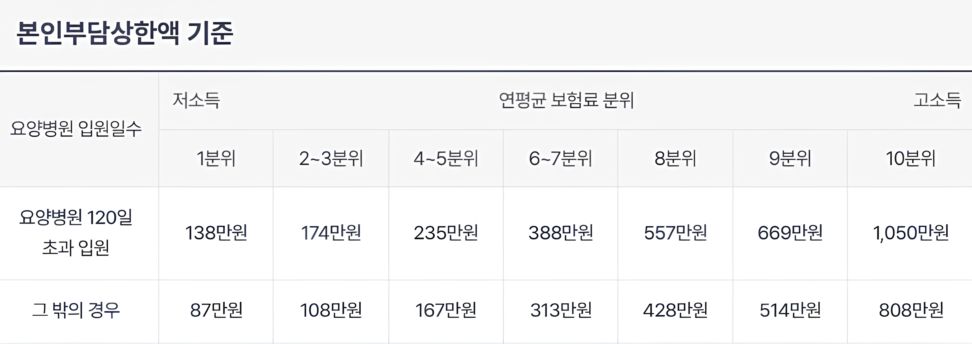 * 요양병원 입원일수가 120일을 초과하는지 여부에 따라 상한액이 달라집니다.