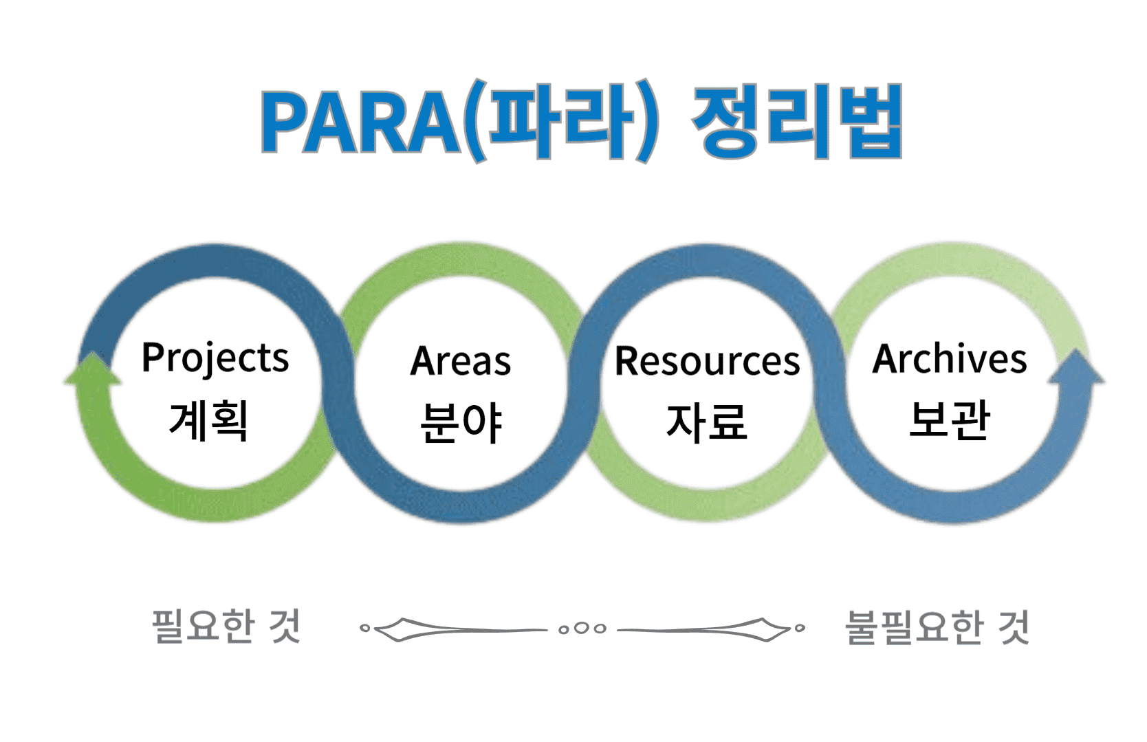 파라(PARA) 정리법은 이 네 가지 범주를 기반으로 정보를 분류하고 정리하여, 필요한 정보를 빠르게 찾고 효율적으로 활용할 수 있도록 돕습니다.